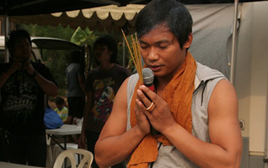 โดยก่อนการเริ่มต้นถ่ายทำพระเอกแอ็คชั่นฮีโร่ของเราจา พนม ก็ทำการไหว้ขอพรสิ่งศักดิ์สิทธิ์เพื่อให้การถ่ายทำเป็นไปอย่างราบรื่น รวบรวมพลังกาย และพลังใจด้วยความฮึกเหิม พร้อมกล่าวเป็นกำลังใจกับทีมนักบิดและน้องๆ พี่ๆ นักแสดงทั้ง 600 คนที่มาร่วมเข้าฉากด้วยกันให้มีจิตใจเป็นหนึ่งเดียว หลังจากนั้นก็ขึ้นขี่มอเตอร์ไซค์ที่ทีมงานเตรียมพร้อม ตั้งขบวนร่วมกับนักแสดงทั้งหมด “ในการถ่ายทำต้มยำกุ้ง 2 ฉากนี้ เห็นทีมงานทั้งหมดที่ล้วนแล้วแต่ตั้งใจ ไม่ว่าจะเป็นทีมนักแสดงที่มาร่วมในการถ่ายทำวันนี้ทั้งบรรดานักบิดที่มีประมาณ 300 กว่าคน นอกจากนี้ยังไม่รวมน้องๆ ที่นั่งอยู่ด้านหลังและต้องพกพาพวกอาวุธ มีดสปาต้าร์อีก 300 กว่าคน เห็นแล้วก็ตกใจเหมือนกัน (หัวเราะ) ยังมีสตันท์อีก และรถอีกหลายสิบคันที่ต้องเข้าฉาก ตำรวจเห็นถึงกับเป่านกหวีด ปิ๊ดปิ๊ดปิ๊ด หยุดหยุดหยุด นึกว่าเค้าตีกันกลางเมือง (หัวเราะ) ก็เพื่อความสมจริงครับ เพราะฉากนี้เราก็ต้องขี่มอเตอร์ไซด์หนีเพื่อเอาตัวรอดจากการไล่ล่าให้ได้