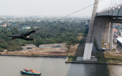โดยในฉากนี้จาจะต้องเสี่ยงตายด้วยการถูกเหวี่ยงตัวตกจากสะพานกาญจนาภิเษก หลังจากที่ถูกไล่ล่าอย่างดุเดือดจากผู้ร้าย ซึ่งสะพานนี้มีความสูงเทียบเท่าได้กับความสูงของตึก 20 ชั้น แต่ระดับความหวาดเสียวถูกทวีคูณขึ้นไปอีกเมื่อพระเอกนักบู๊ต้องถูกจับห้อยตัวค้างกลางอากาศอยู่เหนือแม่น้ำเจ้าพระยา จากรถเครนที่ถูกยื่นออกไปจากตัวสะพานที่สูงขึ้นไปอีก 30 เมตรก่อนที่จะถูกเหวี่ยงตกลงมาใต้สะพานอย่างรวดเร็ว พร้อมกับปะทะกับกระแสลมต้านที่กระแทกเข้ากับร่างกายตลอดเวลา และกว่าจะได้ภาพหวือหวาออกมาสมใจผู้กำกับปรัชญา ปิ่นแก้ว พระเอกจาจะต้องห้อยตัวอยู่เหนือสะพานอยู่หลายชั่วโมงทีเดียวตลอดการถ่ายทำซึ่งผกก.ปรัชญา ได้เล่าให้ฟังถึงไอเดียและความตั้งใจในการถ่ายทำฉากนี้ว่า
